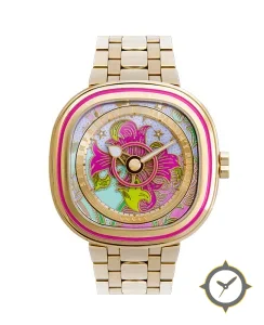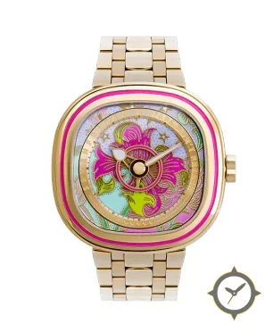 Eine Dress-Uhr mit einem markanten 44mm Auftritt am Handgelenk, gefertigt aus Gold mit einem Zifferblatt in türkis und einer besonderen "enamel-painted, hand-decorated floral motif"-Oberfläche.