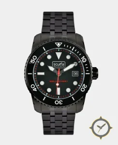 Eine Taucheruhr-Uhr mit einem 35.5mm Gehäuse im Vintage-Stil gefertigt aus Beschichtung mit einem Zifferblatt in schwarz und einer besonderen "matte"-Oberfläche.