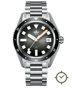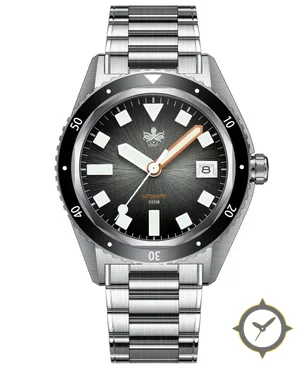 Eine Taucheruhr-Uhr mit einem markanten 41.5mm Auftritt am Handgelenk, gefertigt aus Edelstahl mit einem Zifferblatt in schwarz und einer besonderen "sunburst"-Oberfläche.