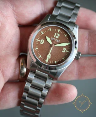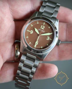 Eine Field-Uhr mit einem vielseitigen 39mm Gehäuse, das an fast jedes Handgelenk passt, gefertigt aus Edelstahl mit einem Zifferblatt in braun und einer besonderen "textured/grain (matte, slightly pebbled)"-Oberfläche.