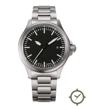 Eine Field-Uhr mit einem 33.5mm Gehäuse im Vintage-Stil gefertigt aus Edelstahl mit einem Zifferblatt in schwarz und einer besonderen "matte"-Oberfläche.