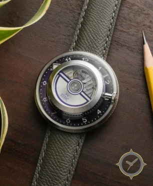 Eine Skelett-Uhr mit einem markanten 49mm Auftritt am Handgelenk, gefertigt aus Edelstahl mit einem Zifferblatt in lila und einer besonderen "brushed metal center with exposed movement"-Oberfläche.