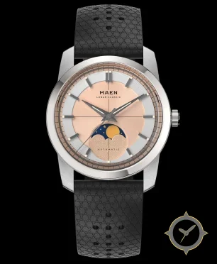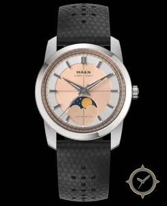Eine Dress-Uhr mit einem 30mm Gehäuse im Vintage-Stil gefertigt aus Edelstahl mit einem Zifferblatt in gold und einer besonderen "sunburst"-Oberfläche und einer wunderschönen Mondphasenanzeige.