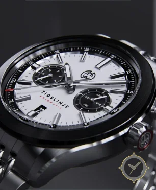 Eine Chronograph-Uhr mit einem 35mm Gehäuse im Vintage-Stil gefertigt aus Edelstahl mit einem Zifferblatt in weiß und einer besonderen "lacquer"-Oberfläche.