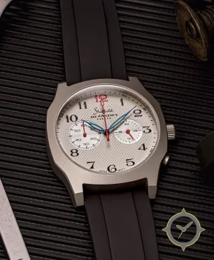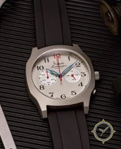 Eine Chronograph-Uhr mit einem vielseitigen 40mm Gehäuse, das an fast jedes Handgelenk passt, gefertigt aus Titan mit einem Zifferblatt in weiß und einer besonderen "hobnail / guilloché"-Oberfläche.