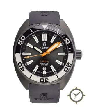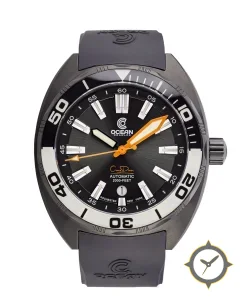 Eine Taucheruhr-Uhr mit einem 37mm Gehäuse im Vintage-Stil gefertigt aus Edelstahl mit einem Zifferblatt in schwarz und einer besonderen "sunburst"-Oberfläche.