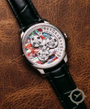 Eine Luxus-Uhr mit einem 35.5mm Gehäuse im Vintage-Stil gefertigt aus Edelstahl mit einem Zifferblatt in weiß und einer besonderen "abalone / mother-of-pearl iridescent"-Oberfläche.