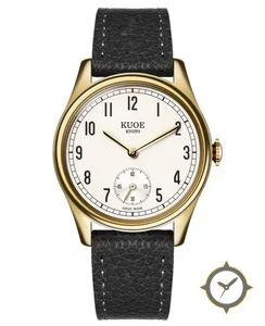 Eine Dress-Uhr mit einem 29.5mm Gehäuse im Vintage-Stil gefertigt aus Gold mit einem Zifferblatt in weiß und einer besonderen "matte lacquer"-Oberfläche.