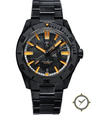 Eine Taucheruhr-Uhr mit einem markanten 45.5mm Auftritt am Handgelenk, gefertigt aus Edelstahl mit einem Zifferblatt in schwarz und einer besonderen "meteorite-style/struck-texture (scratched, crystalline pattern)"-Oberfläche.
