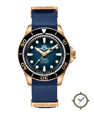 Eine Taucheruhr-Uhr mit einem markanten 45.5mm Auftritt am Handgelenk, gefertigt aus Bronze mit einem Zifferblatt in blau und einer besonderen "sunburst"-Oberfläche.