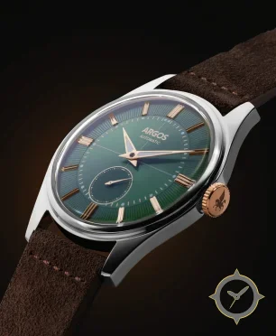 Eine Dress-Uhr mit einem markanten 42.5mm Auftritt am Handgelenk, gefertigt aus Gold mit einem Zifferblatt in grün und einer besonderen "sunburst finish with radial brushing"-Oberfläche.