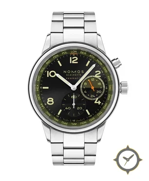 Eine Weltzeituhr-Uhr mit einem markanten 46.5mm Auftritt am Handgelenk, gefertigt aus Edelstahl mit einem Zifferblatt in schwarz und einer besonderen "subtle sunburst / glossy lacquer finish"-Oberfläche, ideal für Weltenbummler dank der Weltzeit-Funktion.