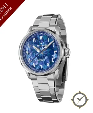 Eine Luxus-Uhr mit einem markanten 45.5mm Auftritt am Handgelenk, gefertigt aus Edelstahl mit einem Zifferblatt in blau und einer besonderen "mother-of-pearl mosaic"-Oberfläche.