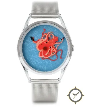 Eine Minimalistisch-Uhr mit einem vielseitigen 39.5mm Gehäuse, das an fast jedes Handgelenk passt, gefertigt aus Edelstahl mit einem Zifferblatt in blau und einer besonderen "speckled / pebble-like texture"-Oberfläche.