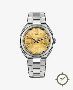 Eine Luxus-Uhr mit einem markanten 48.5mm Auftritt am Handgelenk, gefertigt aus Edelstahl mit einem Zifferblatt in gold und einer besonderen "sunburst / radiating textured finish"-Oberfläche.