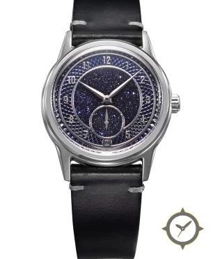 Eine Dress-Uhr mit einem markanten 43.5mm Auftritt am Handgelenk, gefertigt aus Edelstahl mit einem Zifferblatt in marineblau und einer besonderen "aventurine (sparkling) with guilloché outer ring"-Oberfläche.