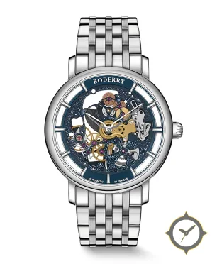 Eine Skelett-Uhr mit einem markanten 49.5mm Auftritt am Handgelenk, gefertigt aus Edelstahl mit einem Zifferblatt in blau und einer besonderen "openworked"-Oberfläche.