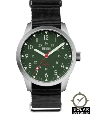 Eine Field-Uhr mit einem 37.5mm Gehäuse im Vintage-Stil gefertigt aus Edelstahl mit einem Zifferblatt in grün und einer besonderen "matte"-Oberfläche.