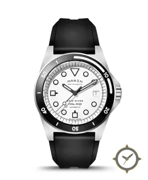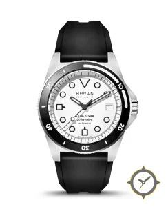 Eine Taucheruhr-Uhr mit einem 37mm Gehäuse im Vintage-Stil gefertigt aus Edelstahl mit einem Zifferblatt in weiß und einer besonderen "matte"-Oberfläche.