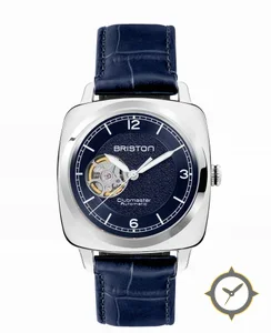 Eine Dress-Uhr mit einem markanten 45mm Auftritt am Handgelenk, gefertigt aus Edelstahl mit einem Zifferblatt in marineblau und einer besonderen "textured/grained center with smoother outer chapter ring (open-heart aperture at 9 o'clock)"-Oberfläche.