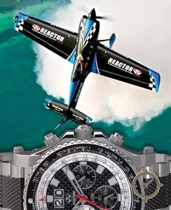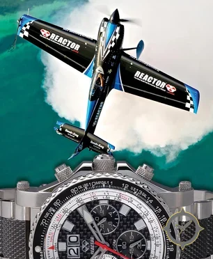 Eine Luftfahrt-Uhr mit einem markanten 47.5mm Auftritt am Handgelenk, gefertigt aus Edelstahl mit einem Zifferblatt in schwarz und einer besonderen "carbon-fiber weave"-Oberfläche.