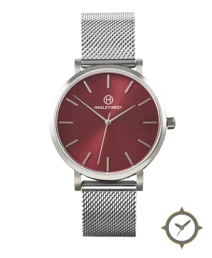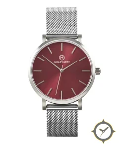 Eine Minimalistisch-Uhr mit einem 35.5mm Gehäuse im Vintage-Stil gefertigt aus Edelstahl mit einem Zifferblatt in rot und einer besonderen "sunburst"-Oberfläche.