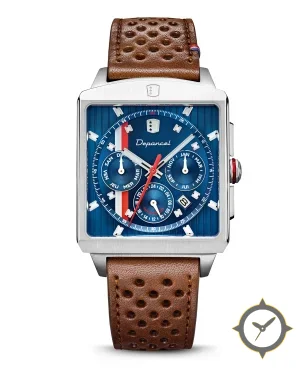 Eine Racing-Uhr mit einem vielseitigen 39.5mm Gehäuse, das an fast jedes Handgelenk passt, gefertigt aus Edelstahl mit einem Zifferblatt in blau und einer besonderen "ribbed (vertical stripes)"-Oberfläche.