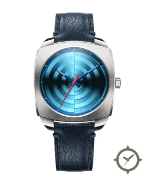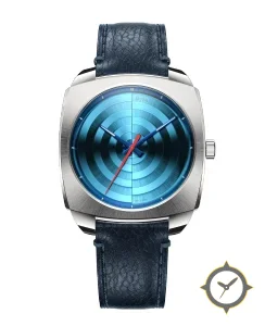 Eine Dress-Uhr mit einem markanten 46.5mm Auftritt am Handgelenk, gefertigt aus Edelstahl mit einem Zifferblatt in blau und einer besonderen "radial sunburst / concentric rings"-Oberfläche.