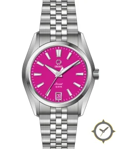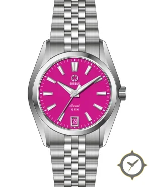 Eine Sport-Uhr mit einem 33mm Gehäuse im Vintage-Stil gefertigt aus Edelstahl mit einem Zifferblatt in lila und einer besonderen "matte"-Oberfläche.