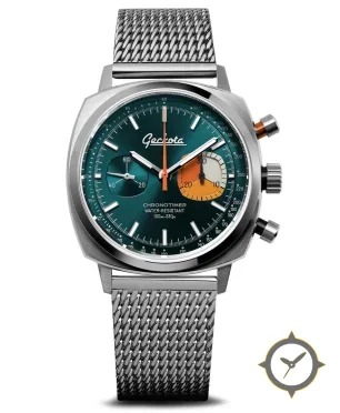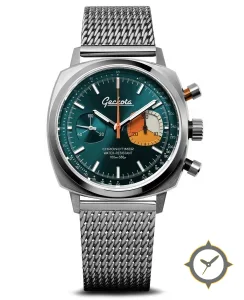 Eine Chronograph-Uhr mit einem markanten 46.5mm Auftritt am Handgelenk, gefertigt aus Edelstahl mit einem Zifferblatt in grün und einer besonderen "sunburst (radial brushing)"-Oberfläche.