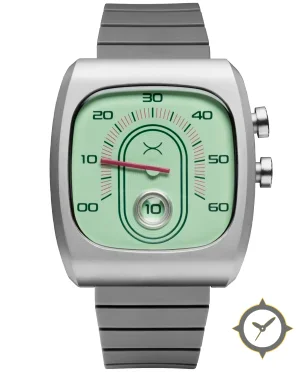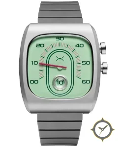 Eine Minimalistisch-Uhr mit einem markanten 46.5mm Auftritt am Handgelenk, gefertigt aus Edelstahl mit einem Zifferblatt in grün und einer besonderen "smooth lacquer with fine concentric ribbing in the central arch"-Oberfläche.