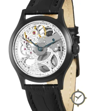 Eine Skelett-Uhr gefertigt aus Edelstahl mit einem Zifferblatt in silber und einer besonderen "skeletonized/exposed movement with engraved bridges"-Oberfläche.