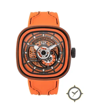 Eine Skelett-Uhr mit einem markanten 45.5mm Auftritt am Handgelenk, gefertigt aus Edelstahl mit einem Zifferblatt in orange und einer besonderen "open-worked / skeleton"-Oberfläche.