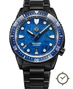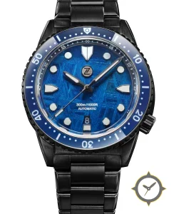 Eine Taucheruhr-Uhr mit einem markanten 47mm Auftritt am Handgelenk, gefertigt aus Edelstahl mit einem Zifferblatt in blau und einer besonderen "textured (meteorite / cross-hatch)"-Oberfläche.