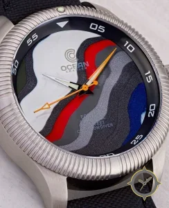 Eine Taucheruhr-Uhr mit einem 37.5mm Gehäuse im Vintage-Stil gefertigt aus Edelstahl mit einem Zifferblatt in weiß und einer besonderen "layered multi-texture (matte and metallic finishes)"-Oberfläche.