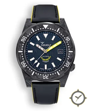 Eine Taucheruhr-Uhr mit einem 33.5mm Gehäuse im Vintage-Stil gefertigt aus Carbon mit einem Zifferblatt in blau und einer besonderen "marbled"-Oberfläche.