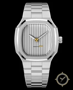 Eine Luxus-Uhr mit einem markanten 41.5mm Auftritt am Handgelenk, gefertigt aus Edelstahl mit einem Zifferblatt in silber und einer besonderen "vertical guilloche stripes"-Oberfläche.