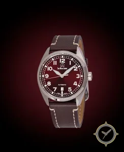 Eine Field-Uhr mit einem vielseitigen 41mm Gehäuse, das an fast jedes Handgelenk passt, gefertigt aus Edelstahl mit einem Zifferblatt in karmesinrot und einer besonderen "sunburst"-Oberfläche.