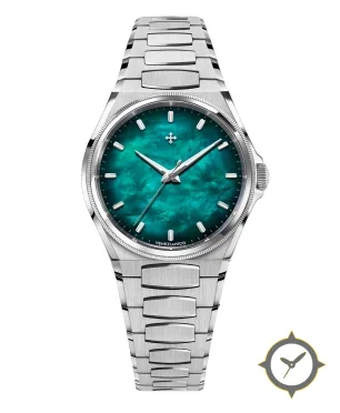 Eine Luxus-Uhr mit einem 37mm Gehäuse im Vintage-Stil gefertigt aus Edelstahl mit einem Zifferblatt in türkis und einer besonderen "mother-of-pearl"-Oberfläche.