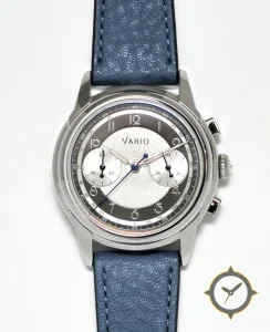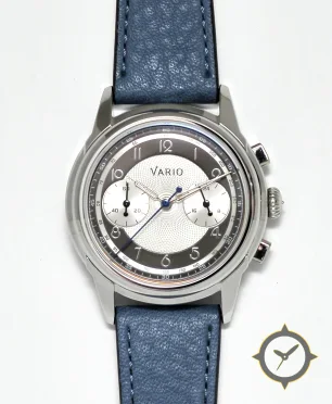 Eine Chronograph-Uhr mit einem 37mm Gehäuse im Vintage-Stil gefertigt aus Edelstahl mit einem Zifferblatt in silber und einer besonderen "guilloché/engine-turned center with smooth outer ring"-Oberfläche.