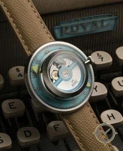 Eine Skelett-Uhr mit einem markanten 44mm Auftritt am Handgelenk, gefertigt aus Edelstahl mit einem Zifferblatt in türkis und einer besonderen "smooth with exposed movement/partially open-work"-Oberfläche.