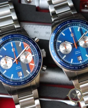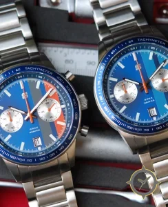 Eine Chronograph-Uhr mit einem markanten 41.5mm Auftritt am Handgelenk, gefertigt aus Edelstahl mit einem Zifferblatt in blau und einer besonderen "sunburst"-Oberfläche.