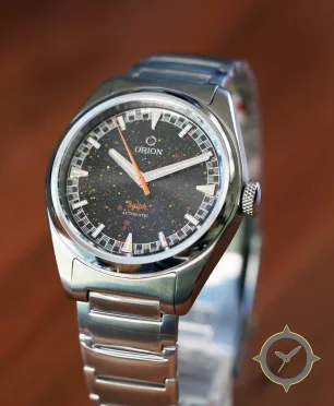 Eine Sport-Uhr mit einem markanten 44mm Auftritt am Handgelenk, gefertigt aus Edelstahl mit einem Zifferblatt in schwarz und einer besonderen "speckled/granular (galaxy-like)"-Oberfläche.