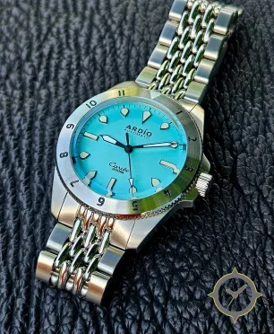 Eine Taucheruhr-Uhr mit einem 35mm Gehäuse im Vintage-Stil gefertigt aus Edelstahl mit einem Zifferblatt in türkis und einer besonderen "smooth lacquer/flat"-Oberfläche.