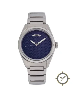 Eine Minimalistisch-Uhr mit einem markanten 43.5mm Auftritt am Handgelenk, gefertigt aus Edelstahl mit einem Zifferblatt in marineblau und einer besonderen "geometric guilloche / repeating textured motif"-Oberfläche.