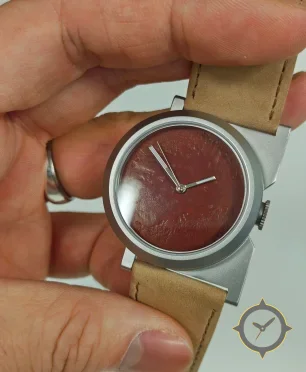 Eine Minimalistisch-Uhr mit einem 26mm Gehäuse im Vintage-Stil gefertigt aus Edelstahl mit einem Zifferblatt in braun und einer besonderen "marbled / organic stone-like texture"-Oberfläche.