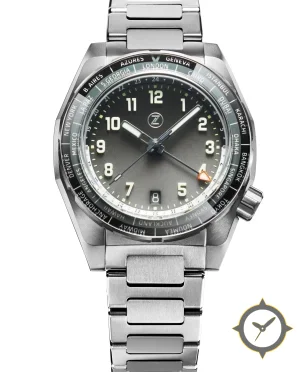 Eine GMT-Uhr mit einem vielseitigen 41mm Gehäuse, das an fast jedes Handgelenk passt, gefertigt aus Edelstahl mit einem Zifferblatt in grau und einer besonderen "sunburst"-Oberfläche, ideal für Weltenbummler dank der Weltzeit-Funktion.