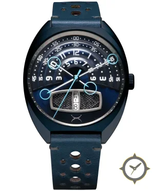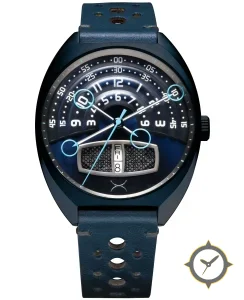 Eine Racing-Uhr mit einem 34mm Gehäuse im Vintage-Stil gefertigt aus Edelstahl mit einem Zifferblatt in blau und einer besonderen "sunburst gradient with concentric raised rings and textured lower grille"-Oberfläche.