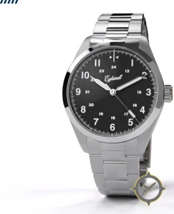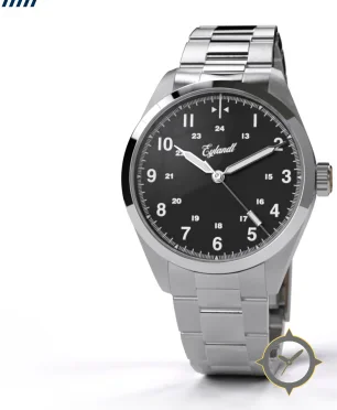 Eine Pilot-Uhr mit einem 34mm Gehäuse im Vintage-Stil gefertigt aus Edelstahl mit einem Zifferblatt in schwarz und einer besonderen "matte"-Oberfläche.