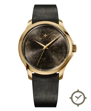 Eine Dress-Uhr mit einem 33.5mm Gehäuse im Vintage-Stil gefertigt aus Gold mit einem Zifferblatt in schwarz und einer besonderen "marbled/aged patina with gold veining"-Oberfläche.